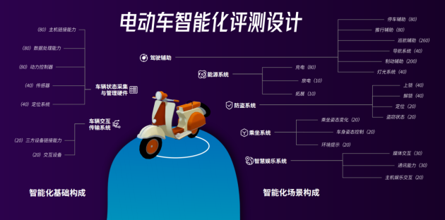 要对电动两轮车智能化进行评级,智能化评测才是第一步。智能化测试涵盖了驾驶辅助,能源系统,防盗系统,乘坐系统,智慧娱乐系统等项目,同样的,每个项目下又细分了多个评测内容。